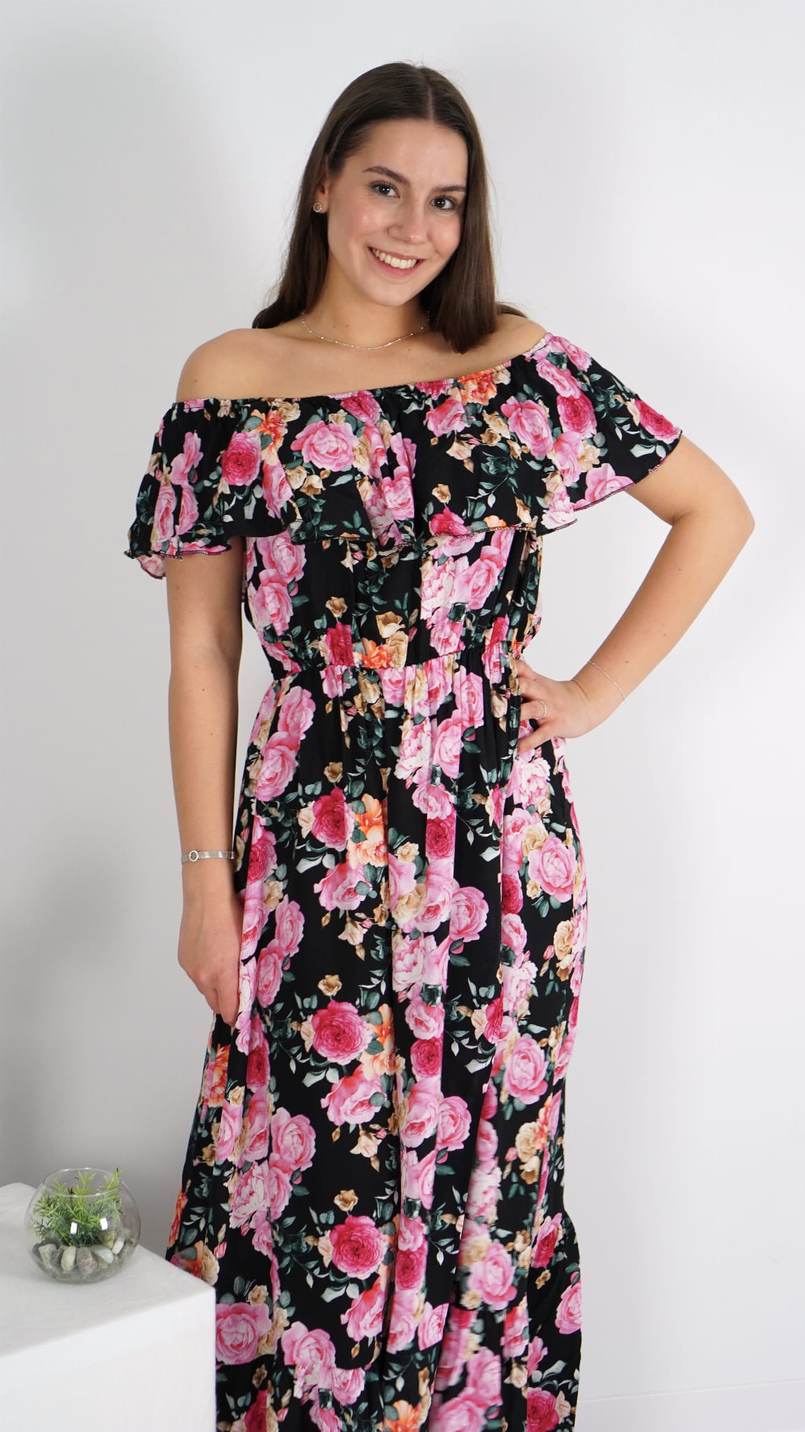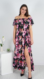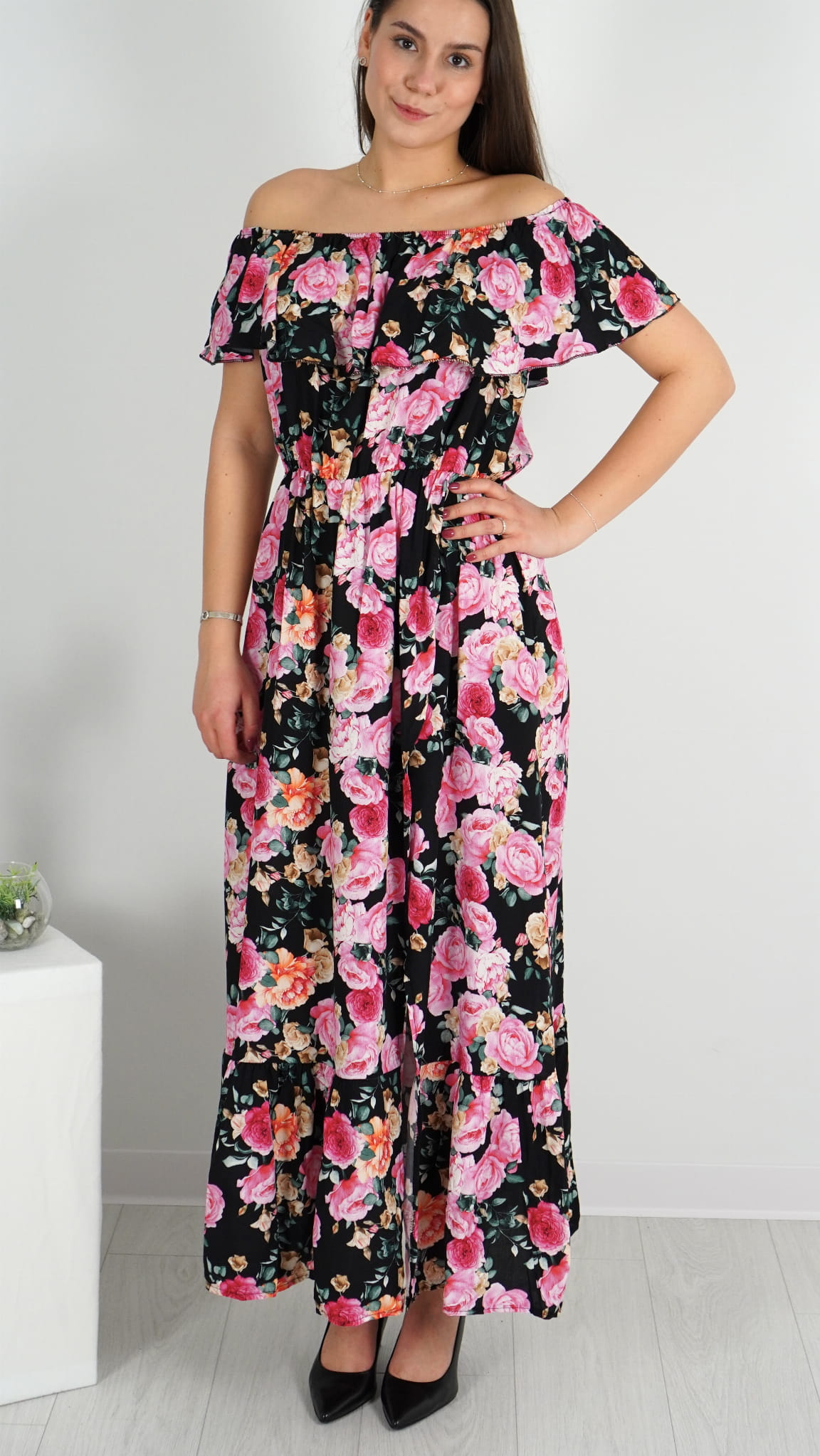 Długa Sukienka Hiszpanka Czarna w Kwiaty FRANCI