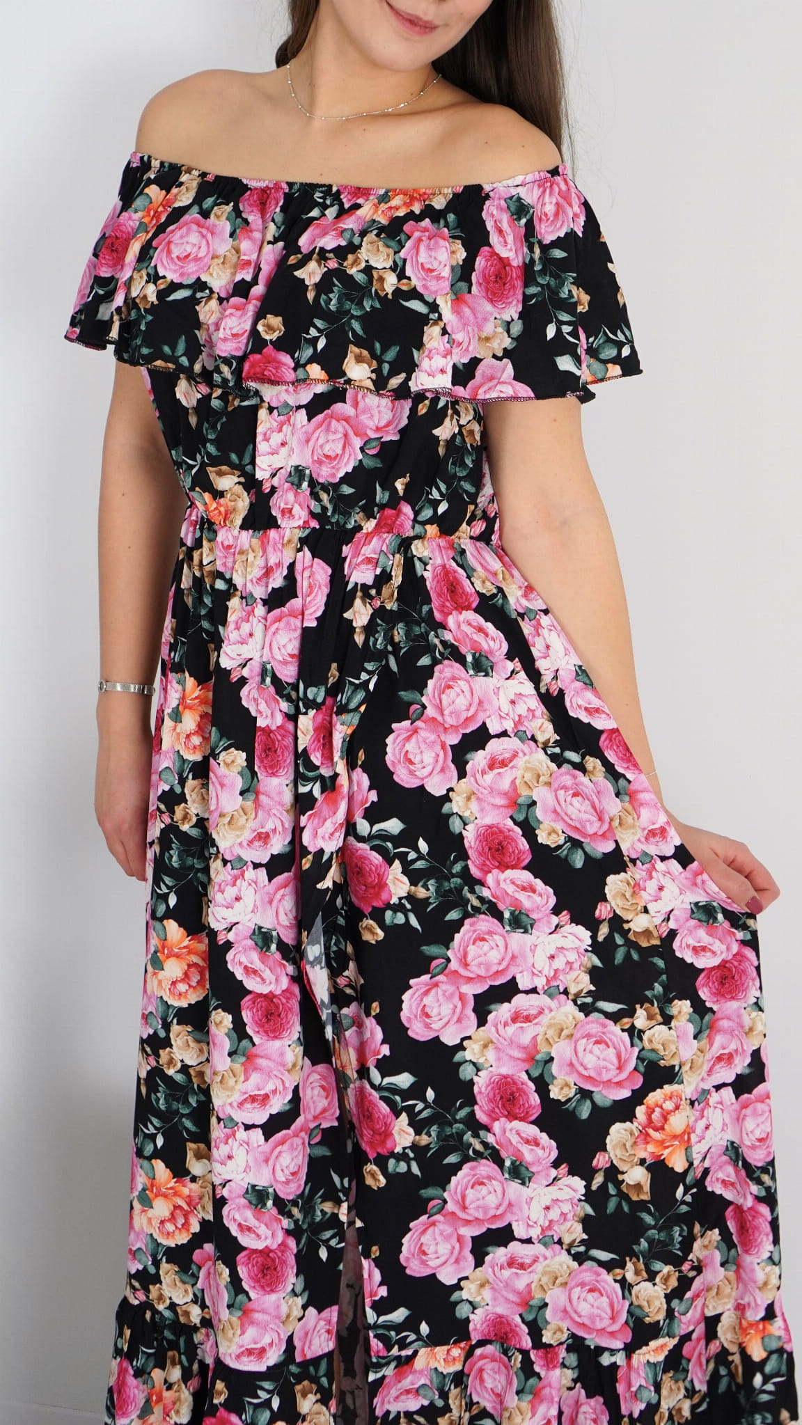 Długa sukienka hiszpanka z falbanką, która pięknie dopasowuje się do sylwetki. Lekki i zwiewny model idealny na wiosnę i lato, pasujący zarówno na mniejsze, jak i większe rozmiary, dzięki gumce w biuście.