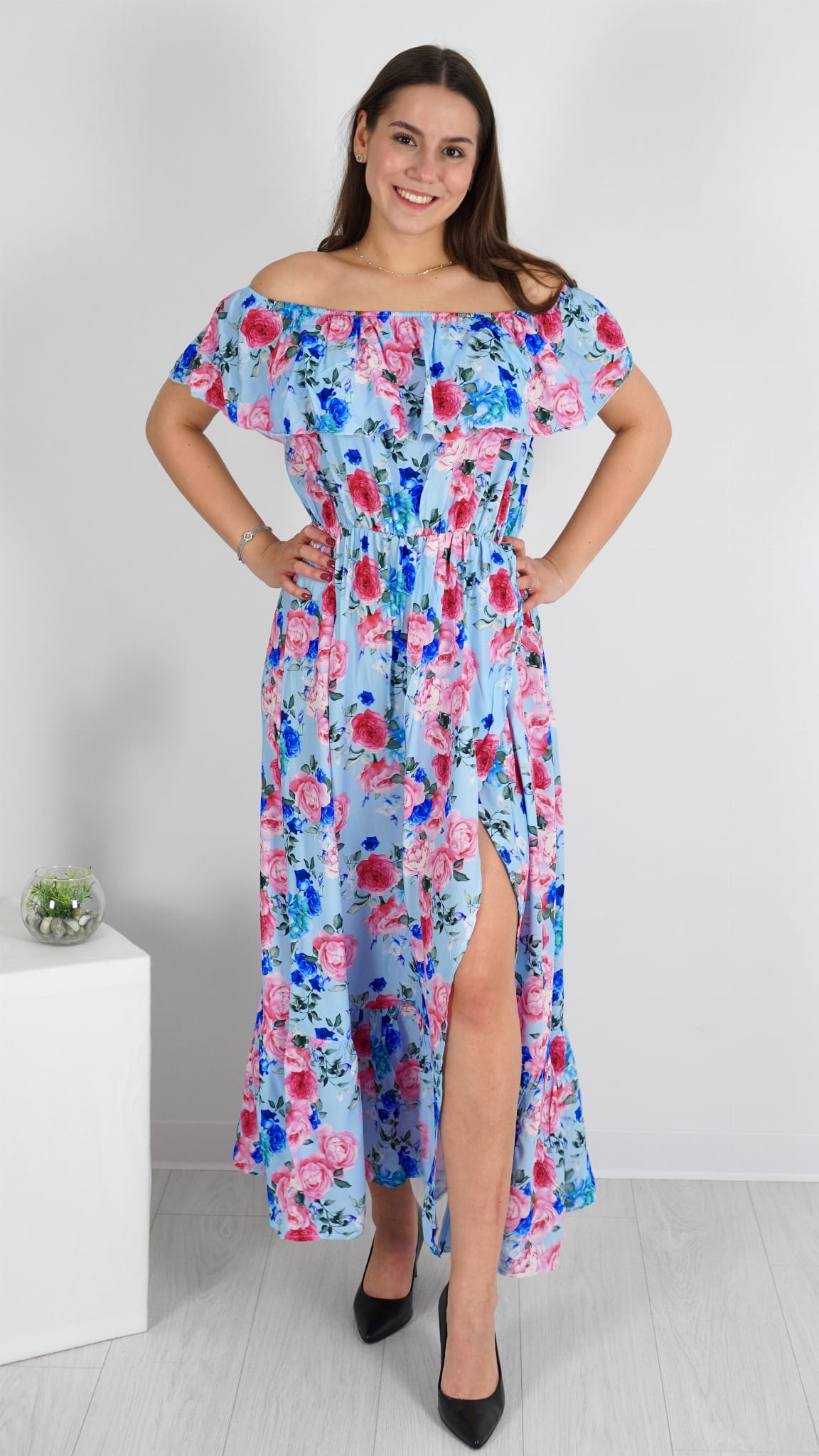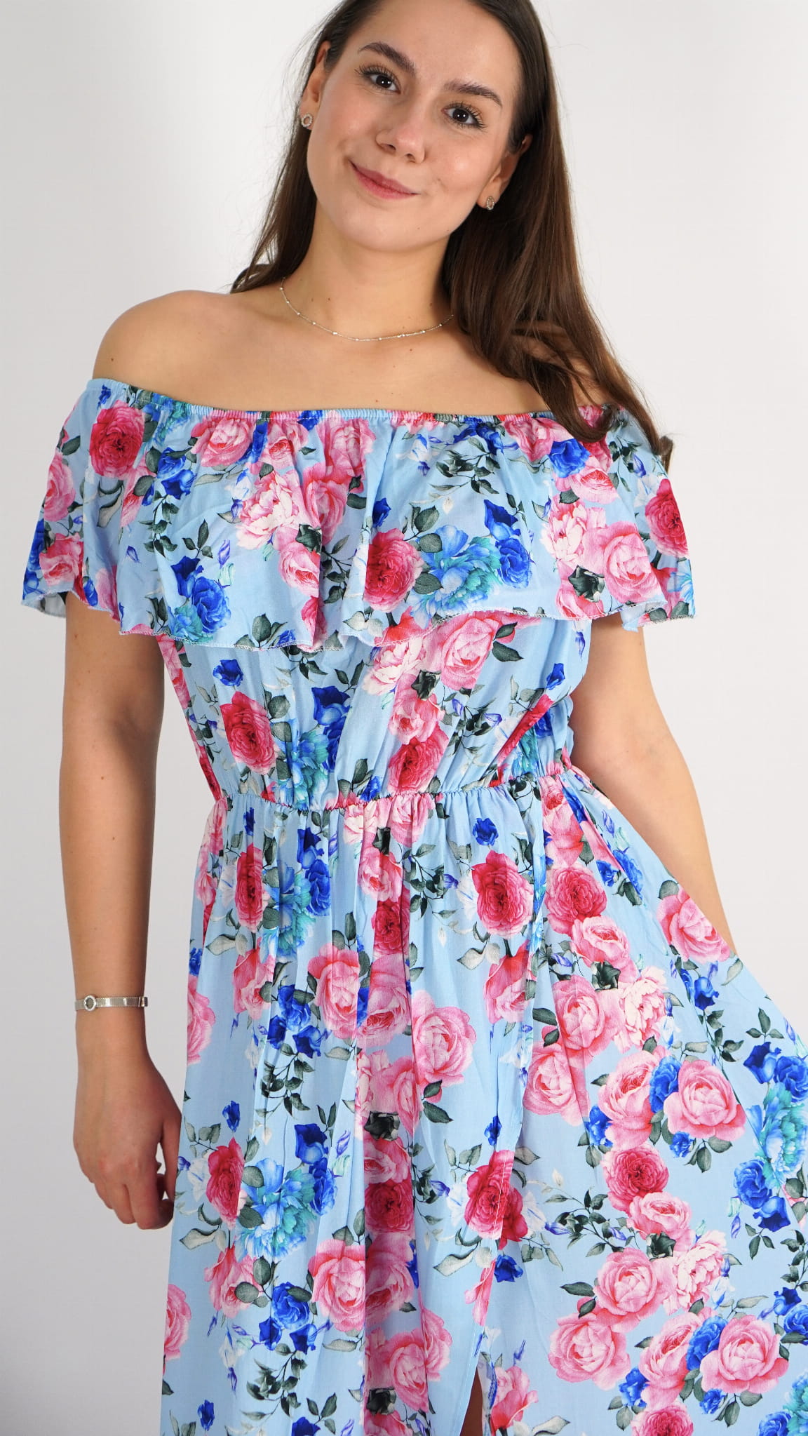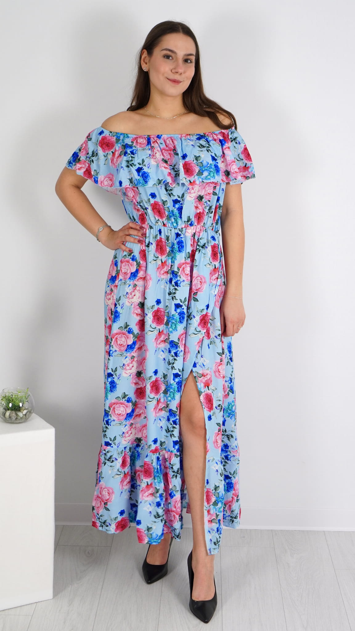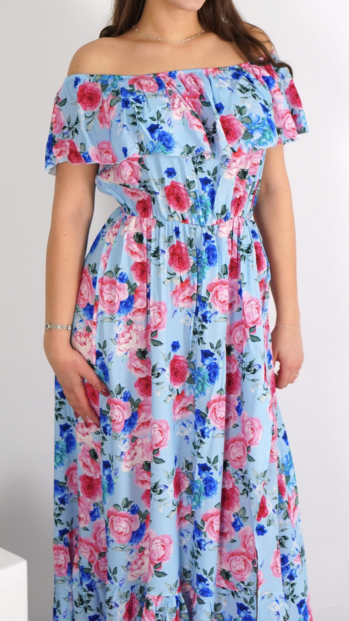 Długa sukienka hiszpanka z falbanką, która pięknie dopasowuje się do sylwetki. Lekki i zwiewny model idealny na wiosnę i lato, pasujący zarówno na mniejsze, jak i większe rozmiary, dzięki gumce w biuście.