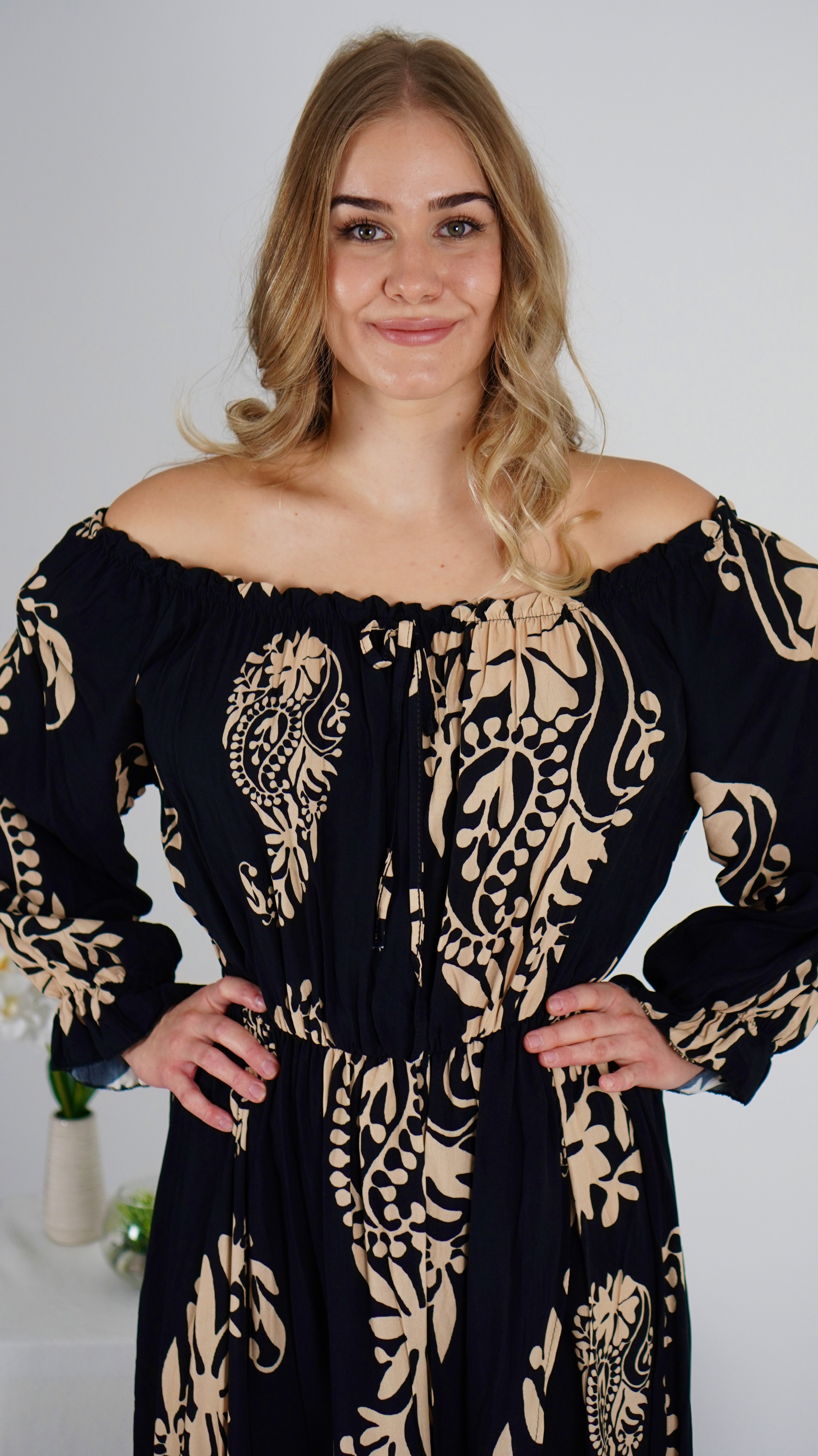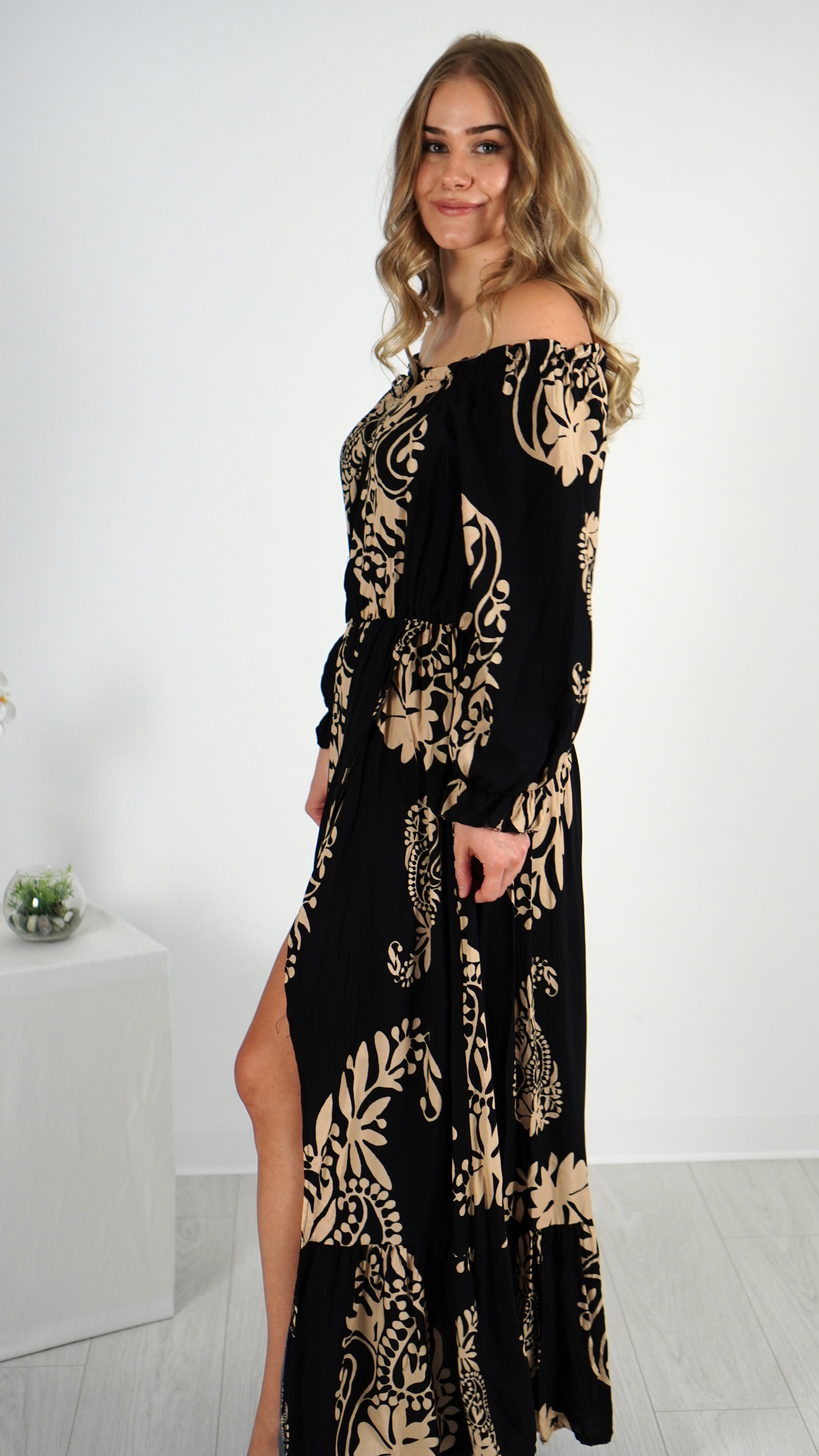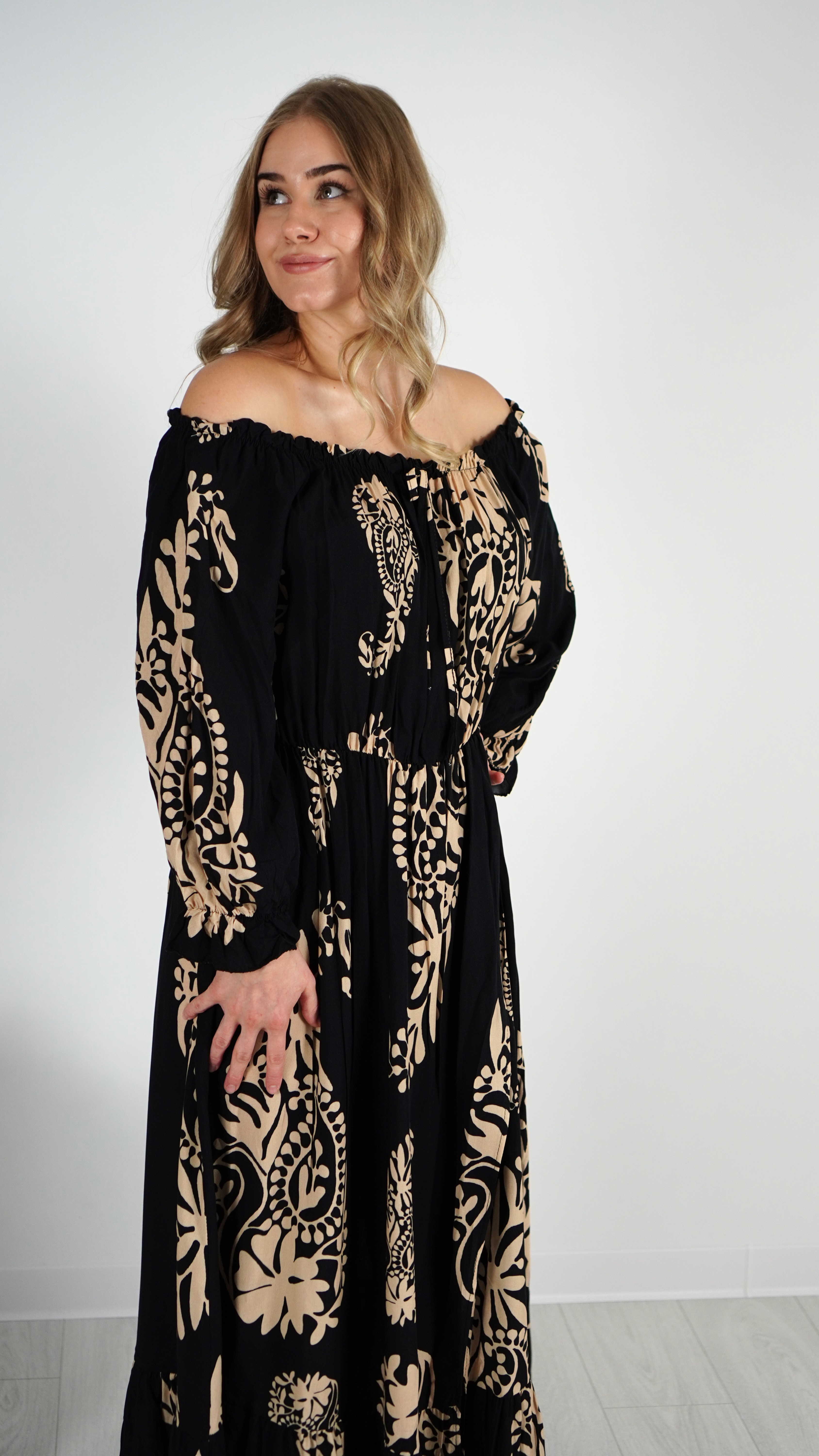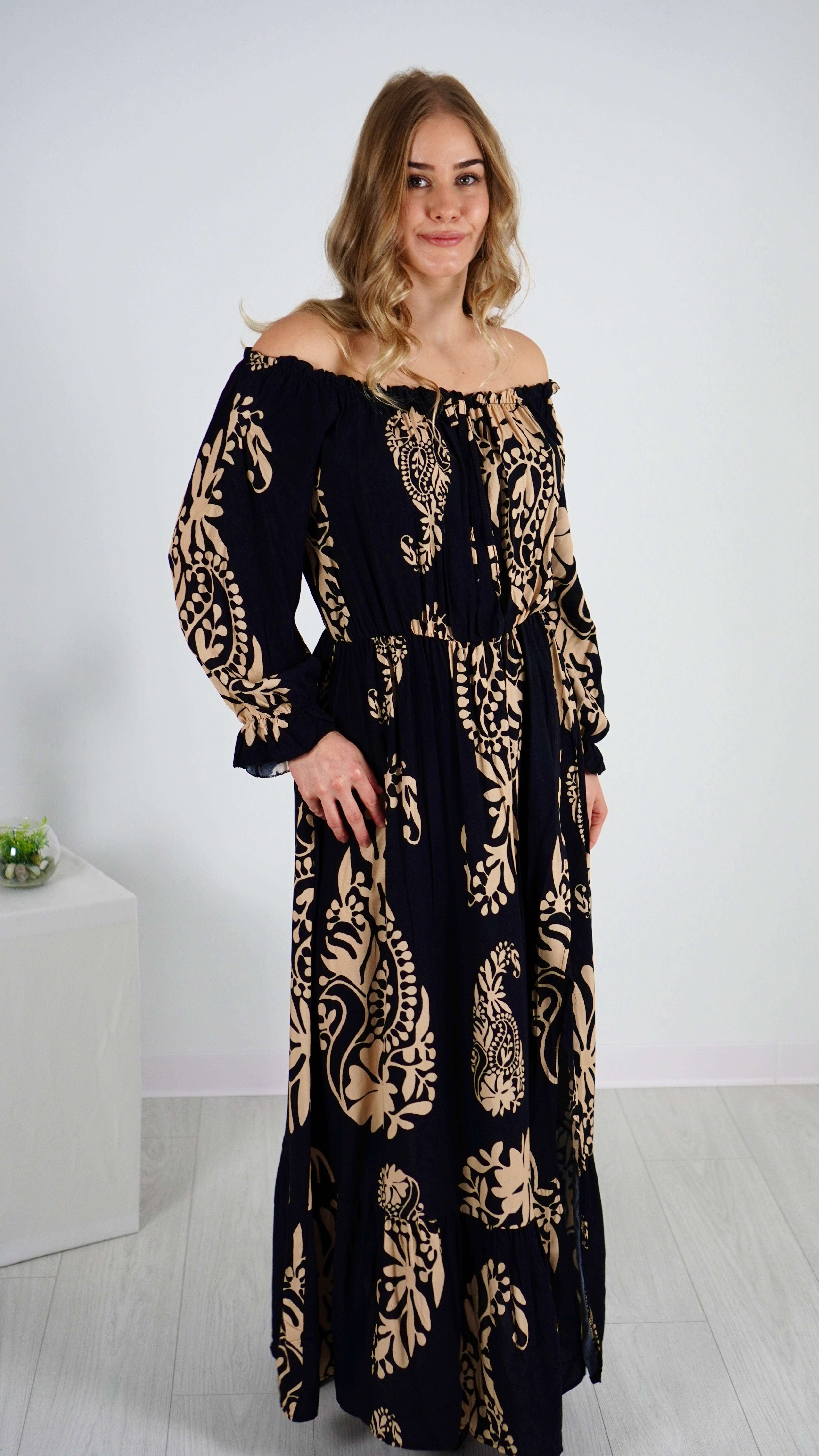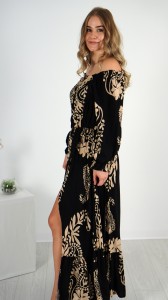 Długa Sukienka Hiszpanka RITA Czarna z Beżowym Wzorem
