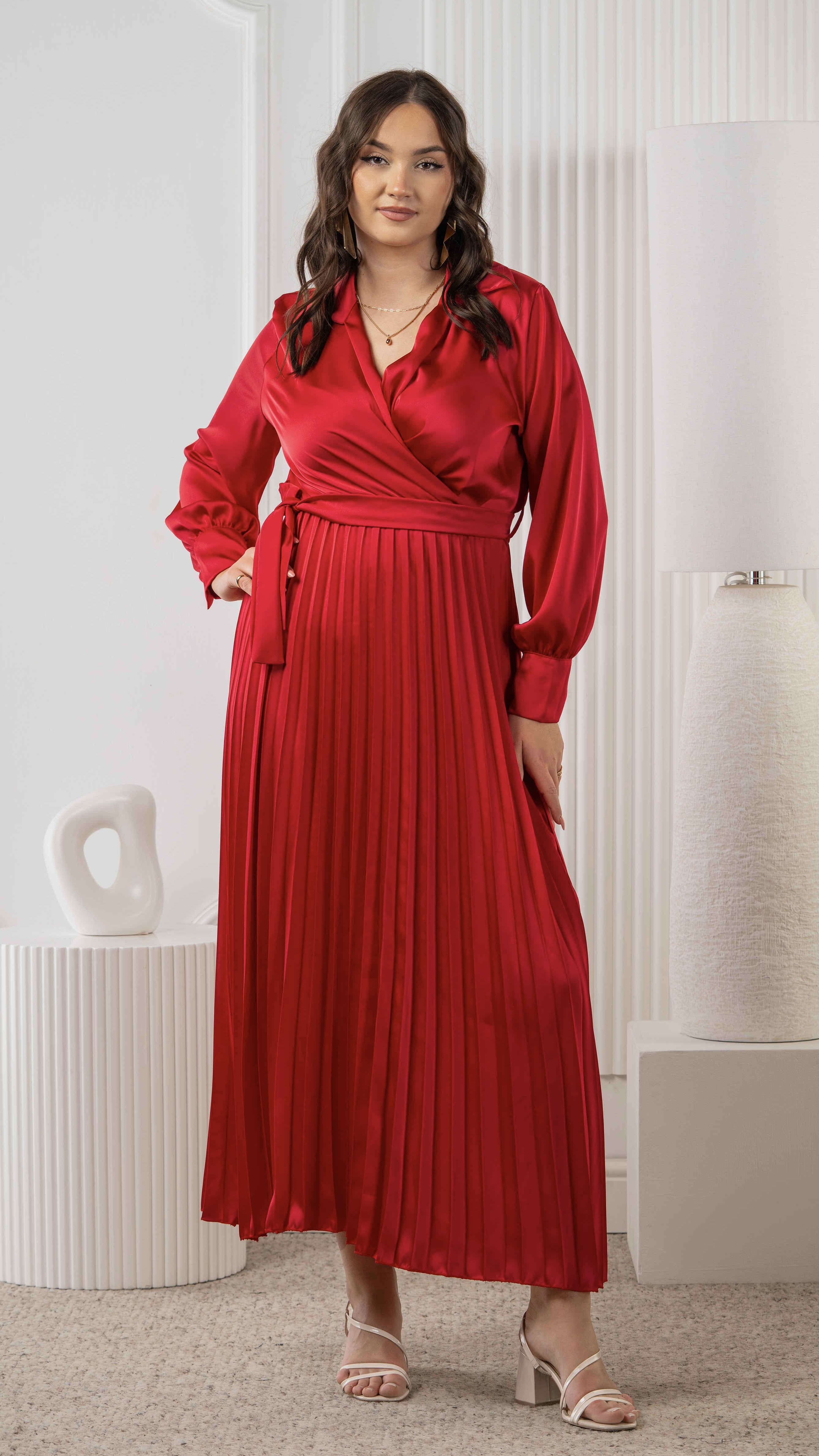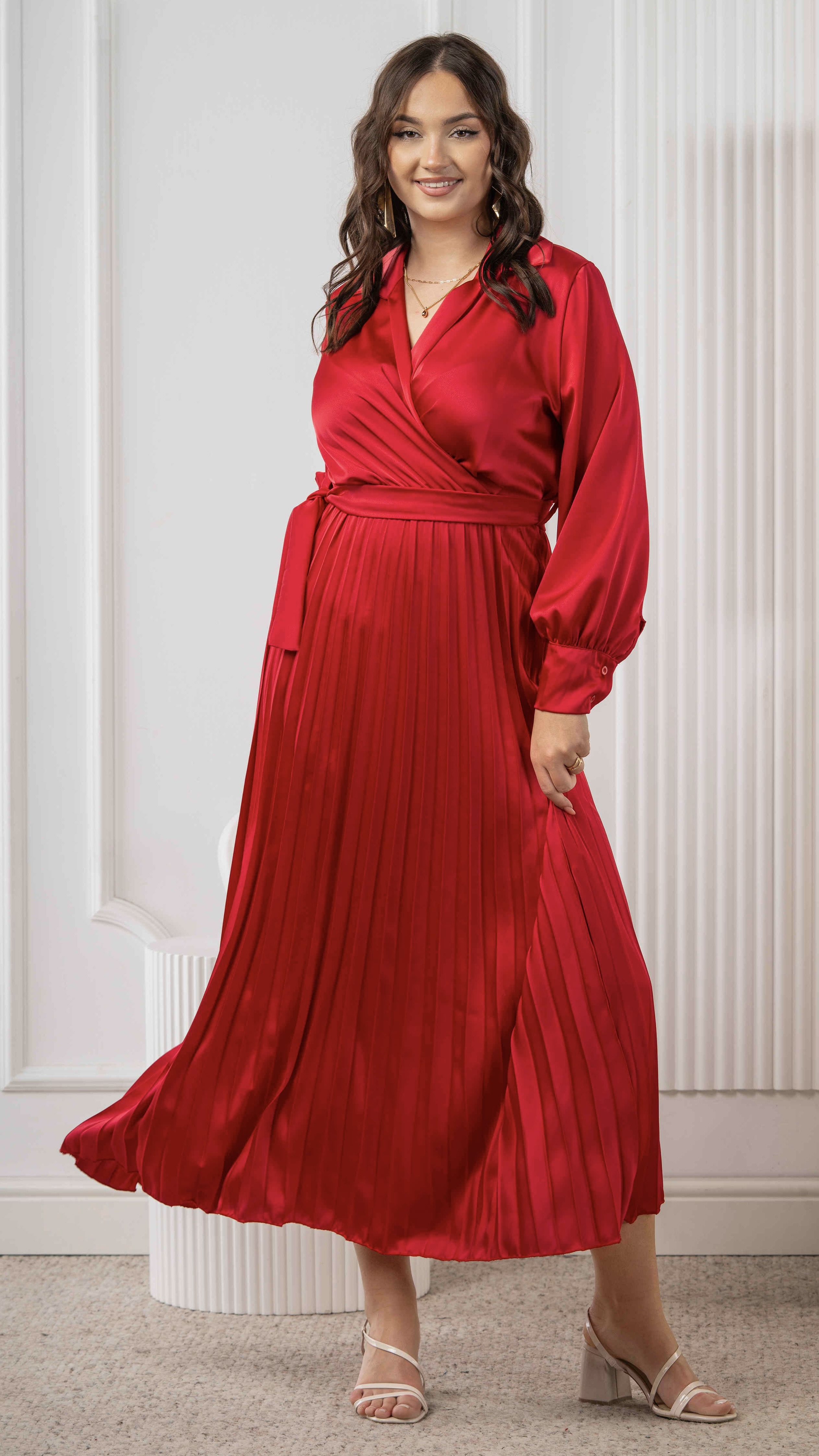Czerwona satynowa sukienka plisowana z kołnierzykiem – wiązana w pasie