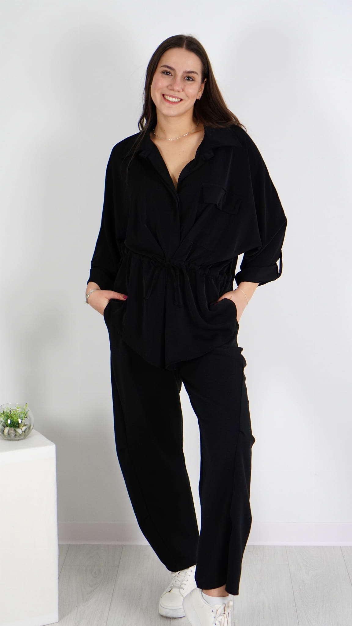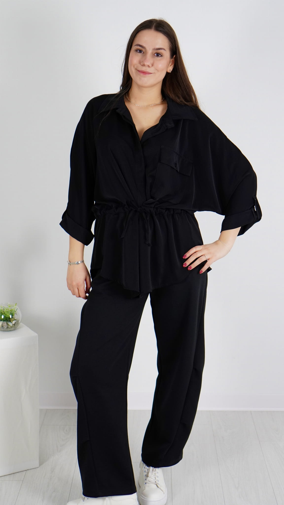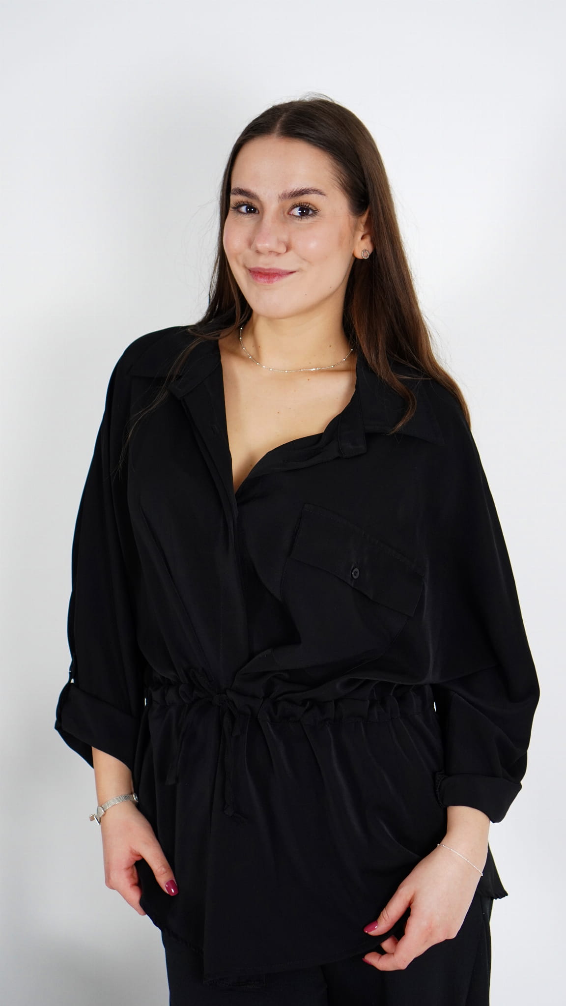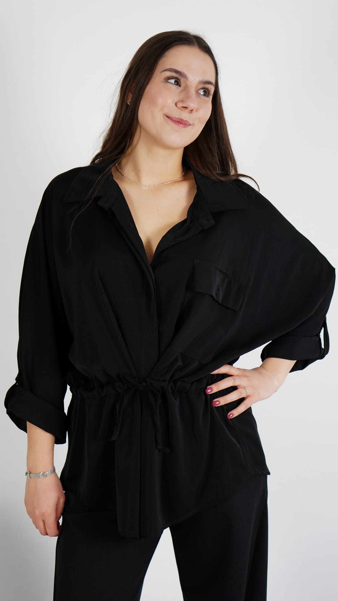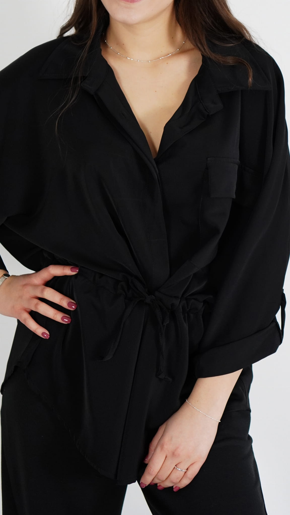 Elegancka koszula damska z wiązaniem w talii, które pozwala dopasować szerokość do sylwetki i pięknie podkreśla figurę.