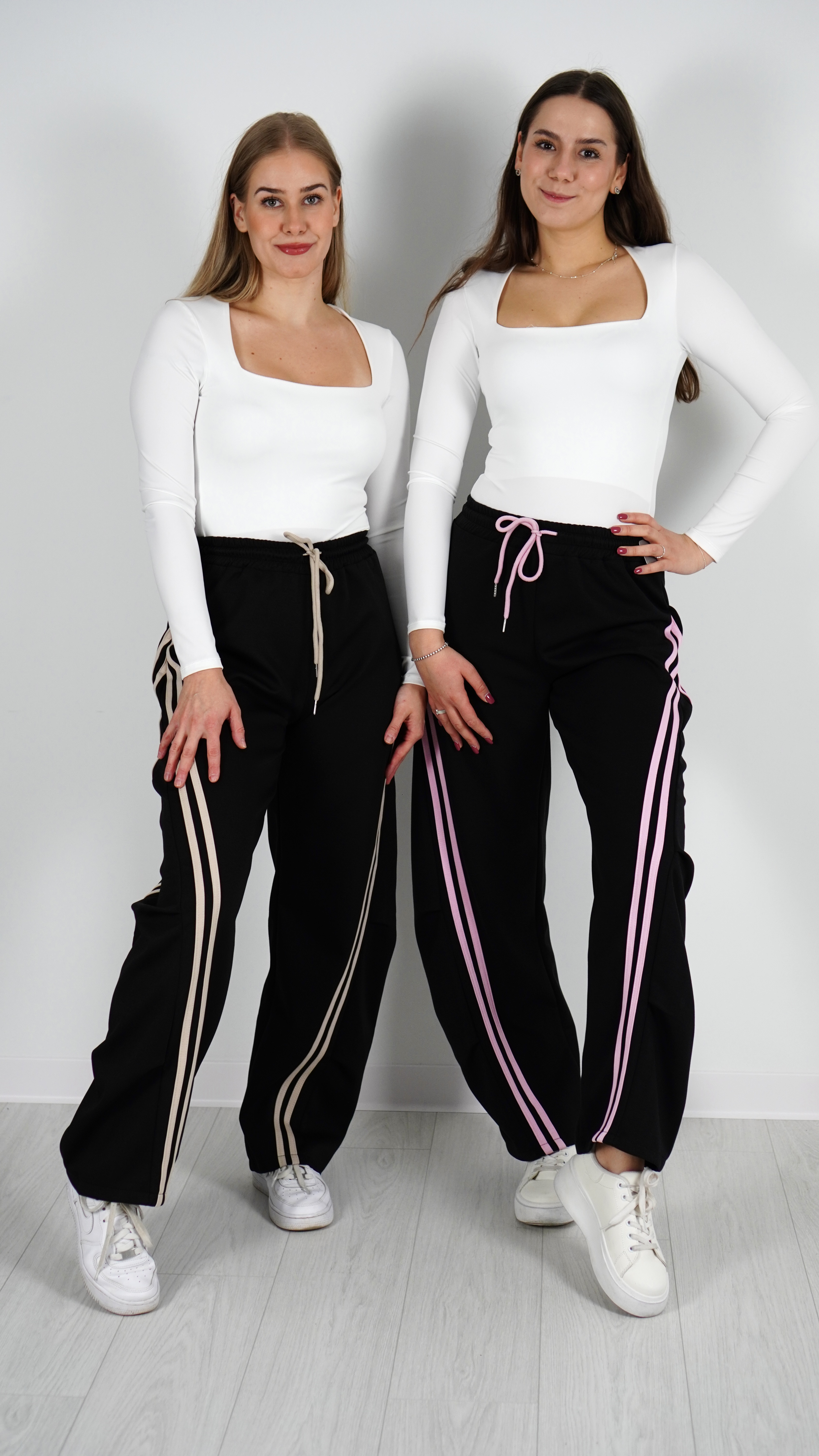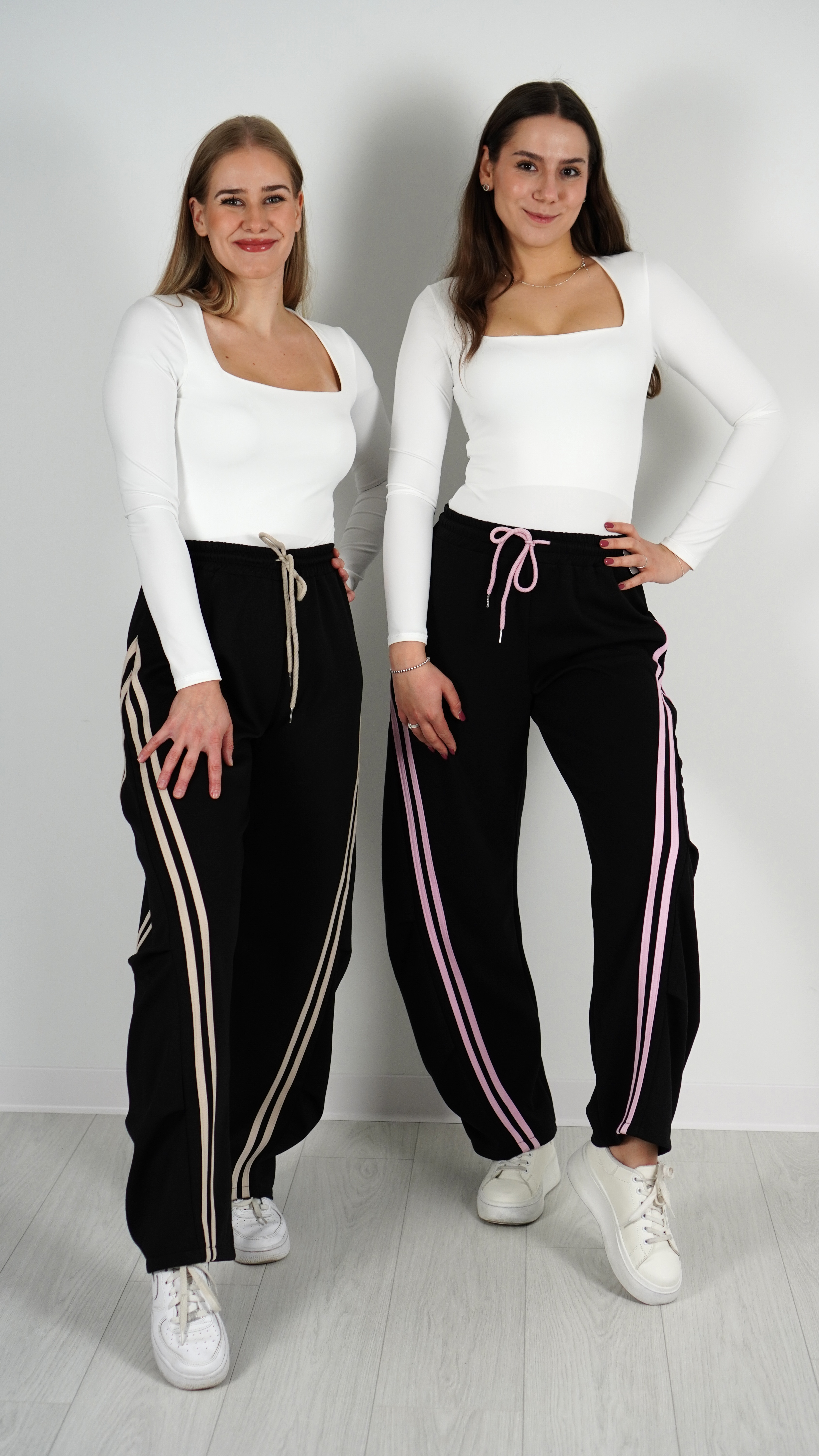 Luźne spodnie z szerokimi nogawkami, gumka w pasie + sznurek do regulacji.