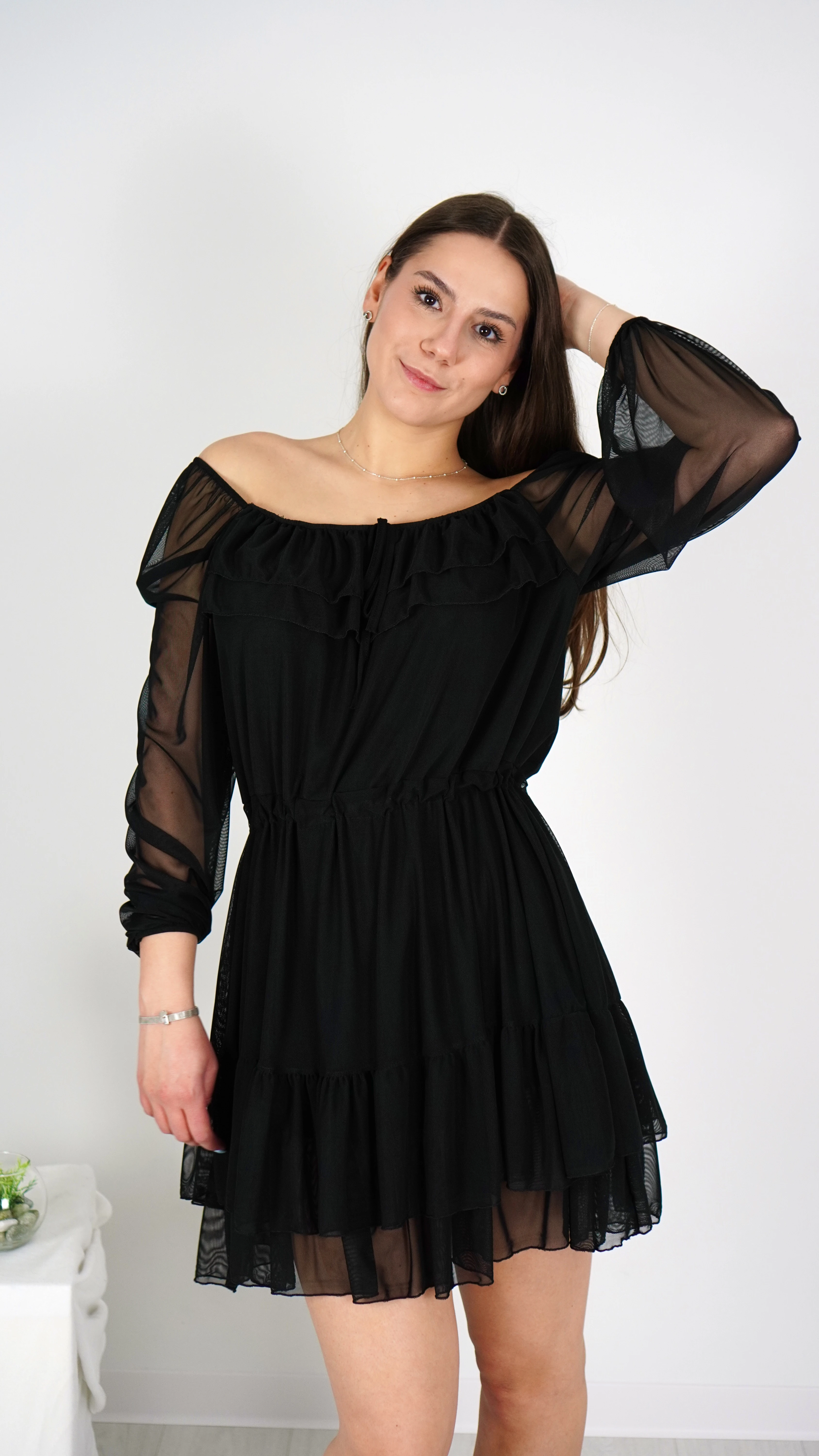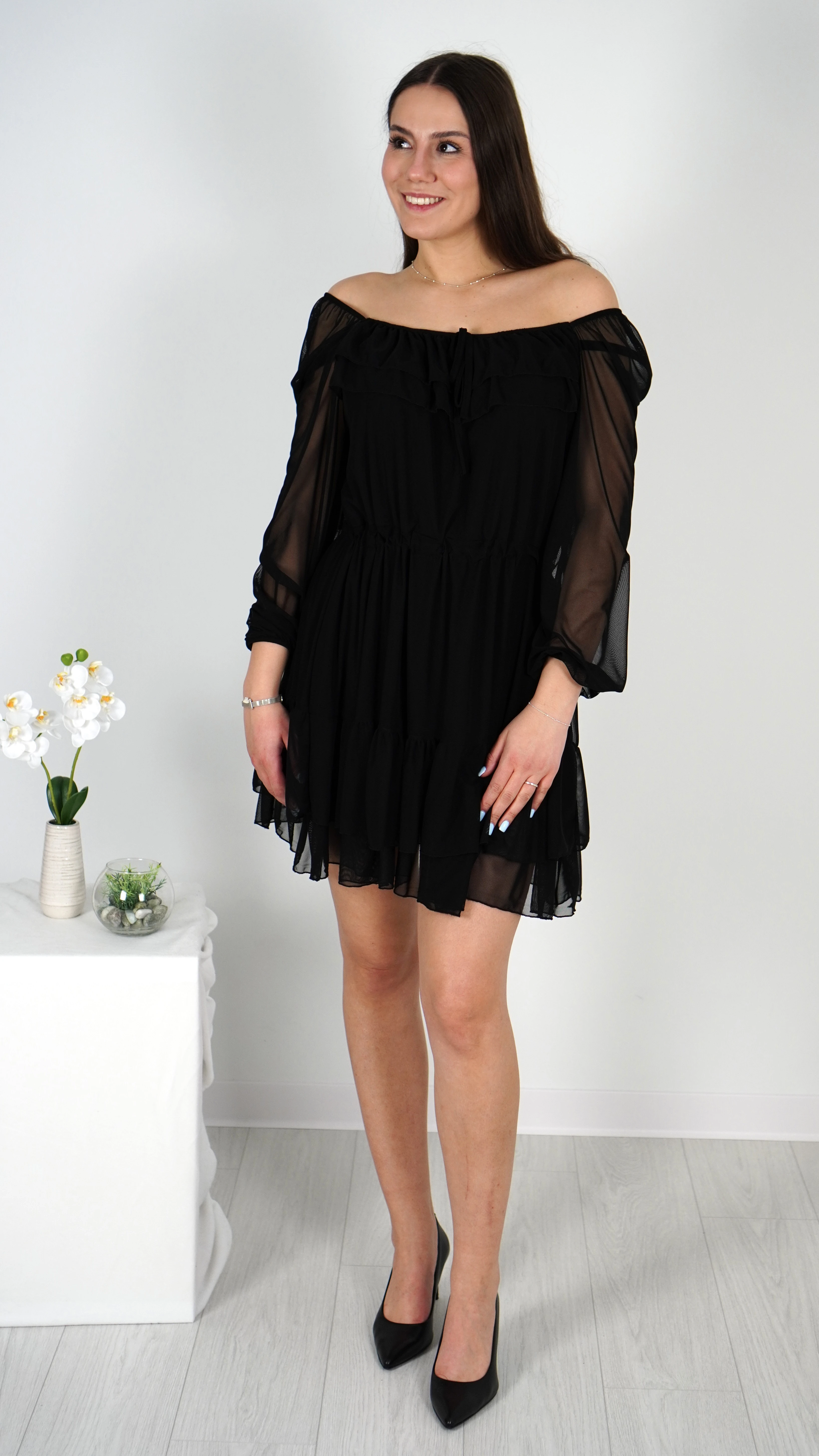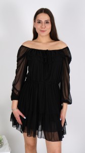Sukienka Hiszpanka Czarna Krótka z Falbanką CATLINA Rękawy z Siateczki