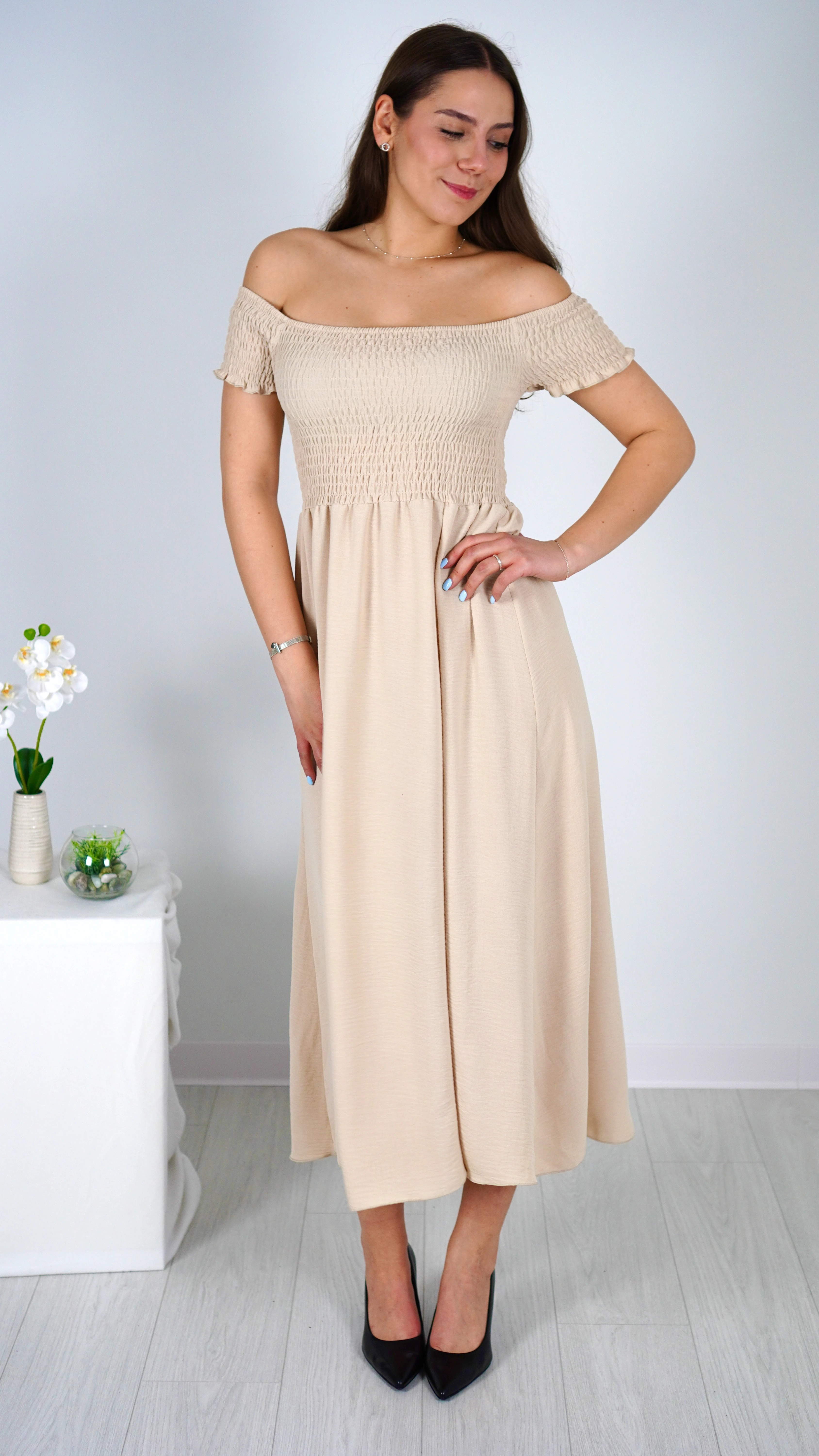 Długa sukienka z marszczonym dekoltem na gumce, która pięknie dopasowuje się do sylwetki. Przyjemny i zwiewny model idealny na wiosnę i lato, pasujący zarówno na mniejsze, jak i większe rozmiary.