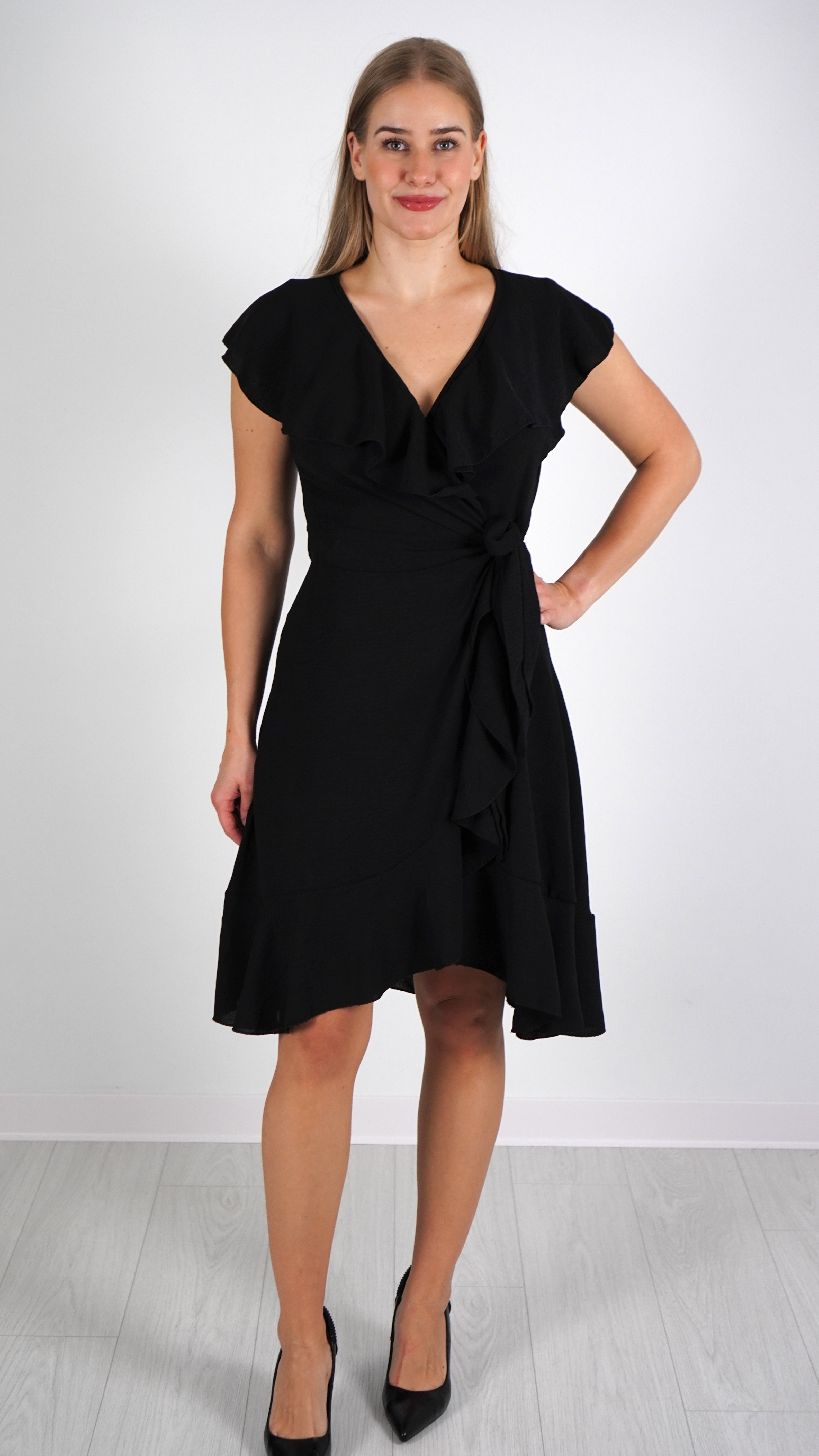 Czarna sukienka kopertowa z falbankami – elegancka sukienka damska na co dzień