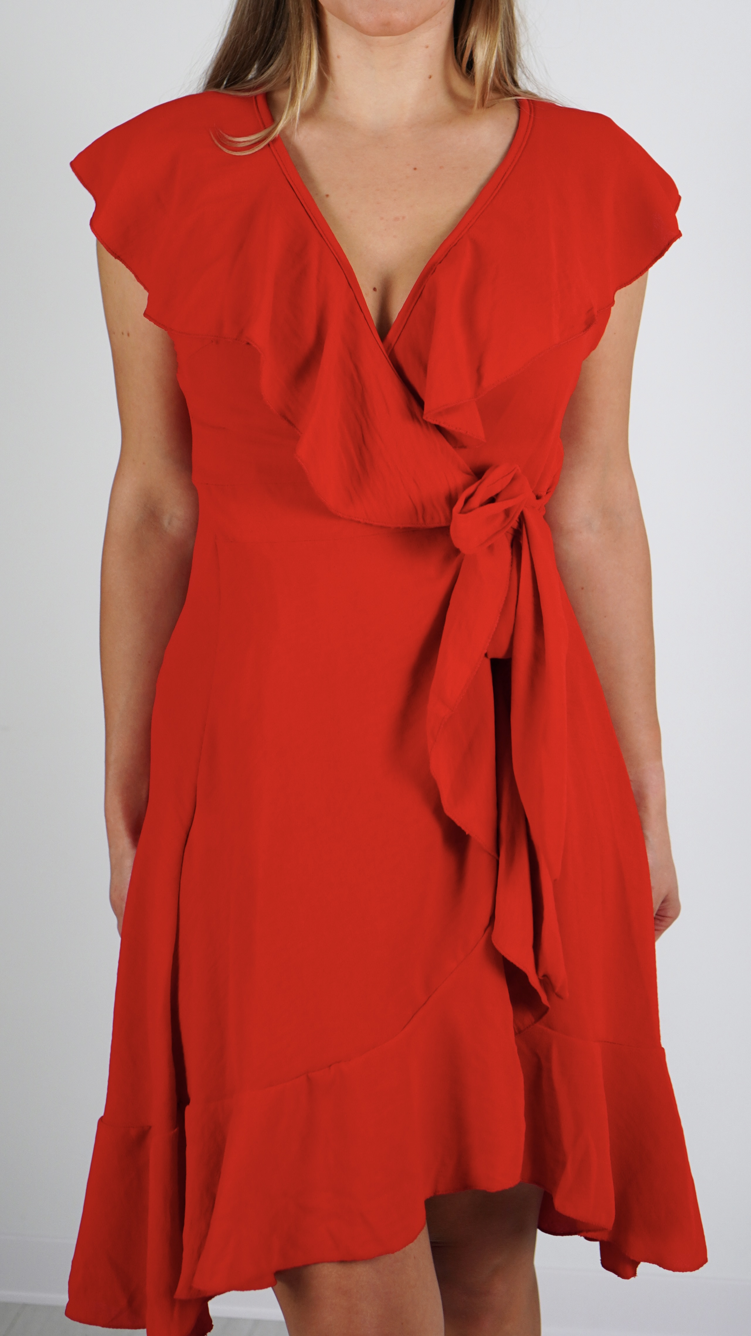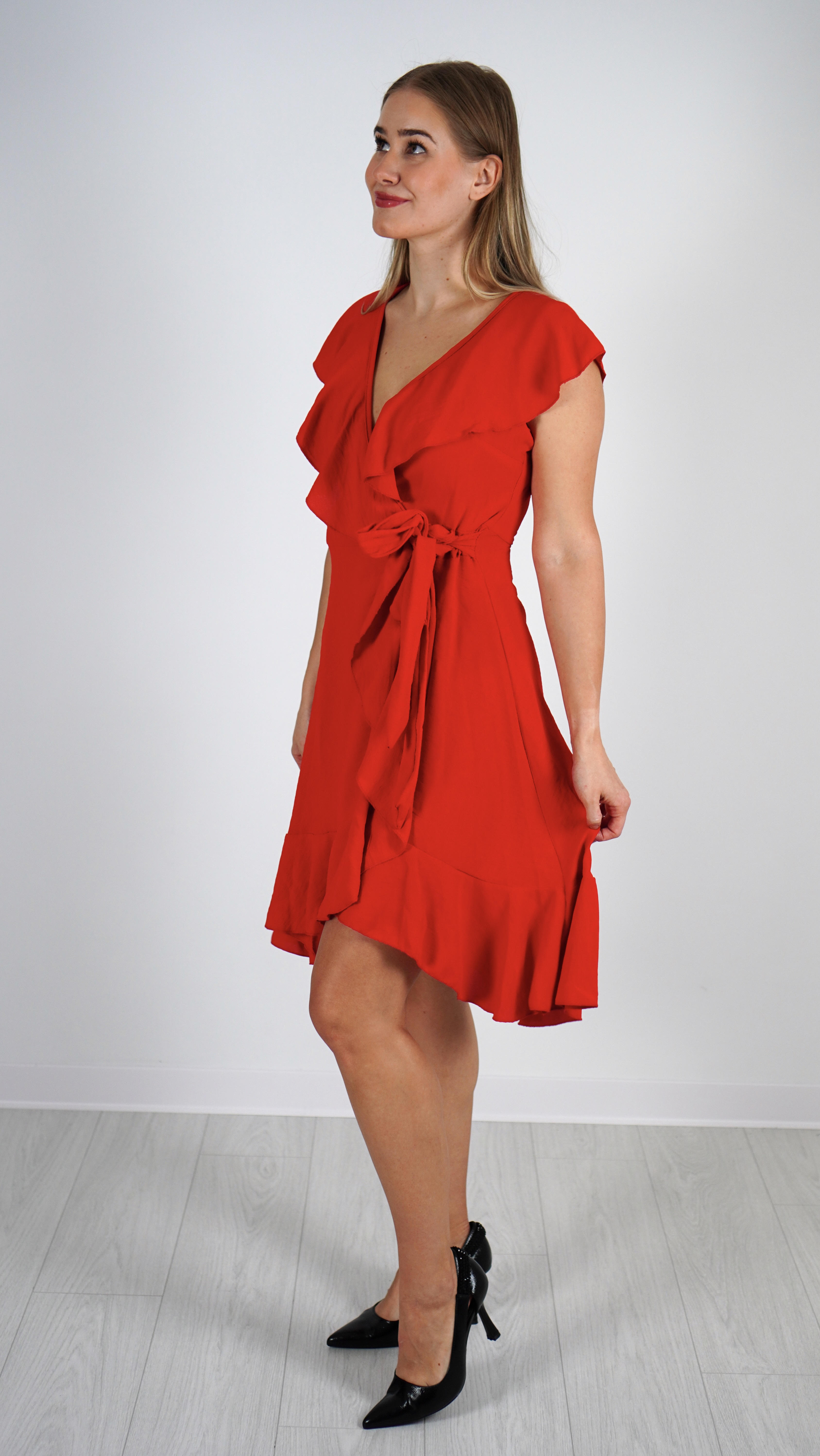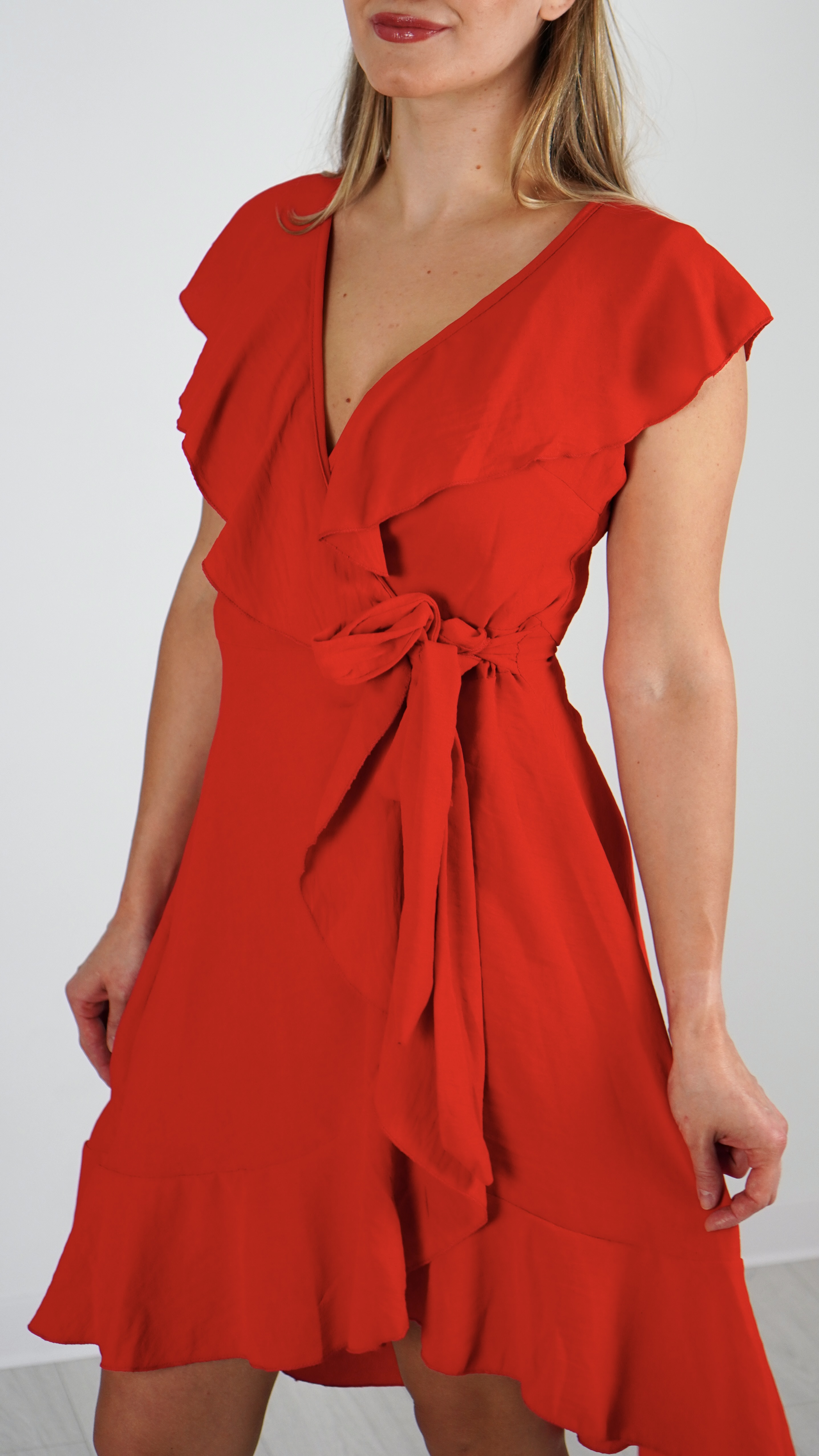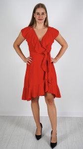 Czerwona sukienka kopertowa z falbankami – elegancka sukienka damska na co dzień i na przyjęcia