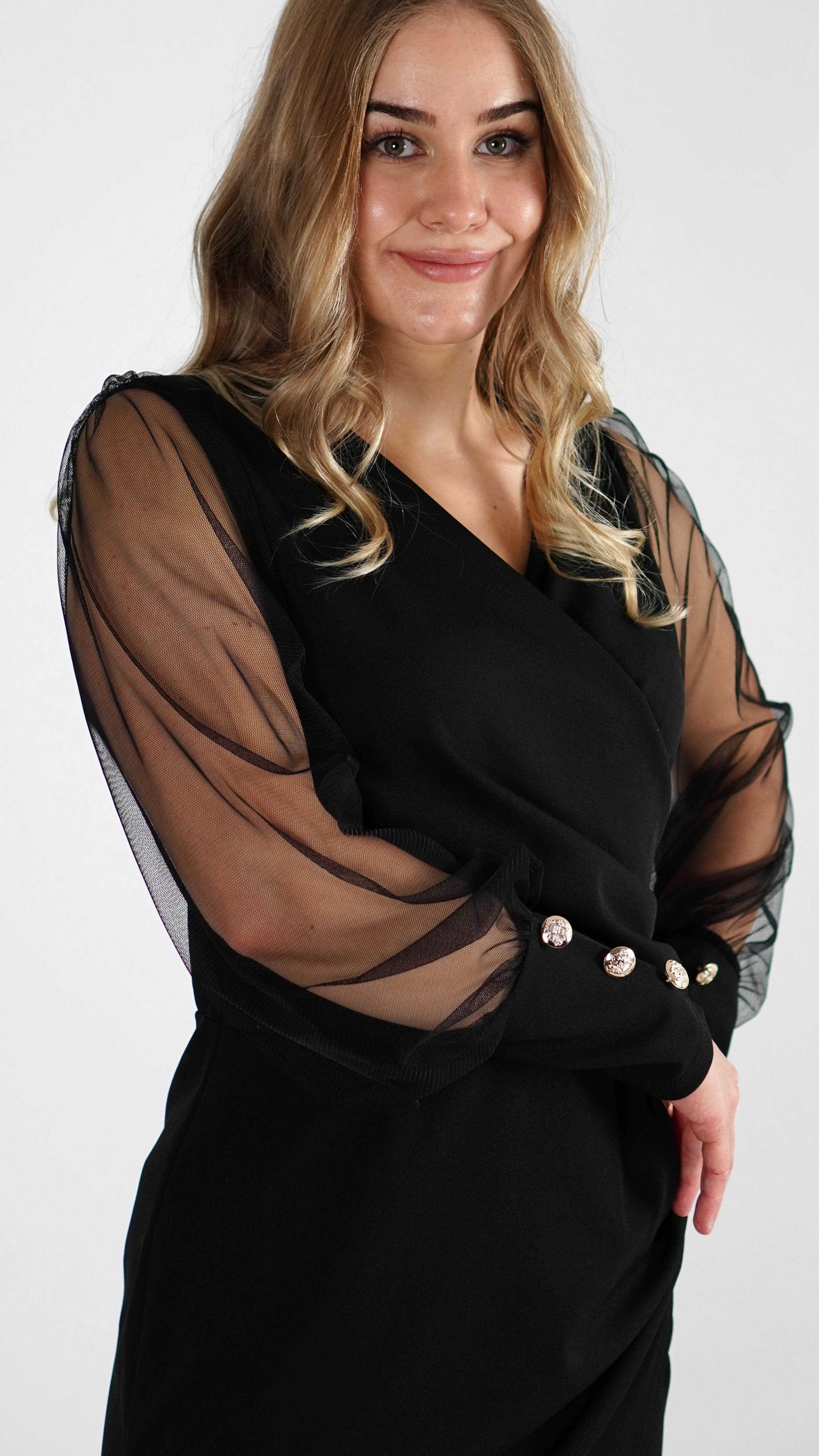 Sukienka Kopertowa z Przezroczystymi Rękawami Czarna VELIA